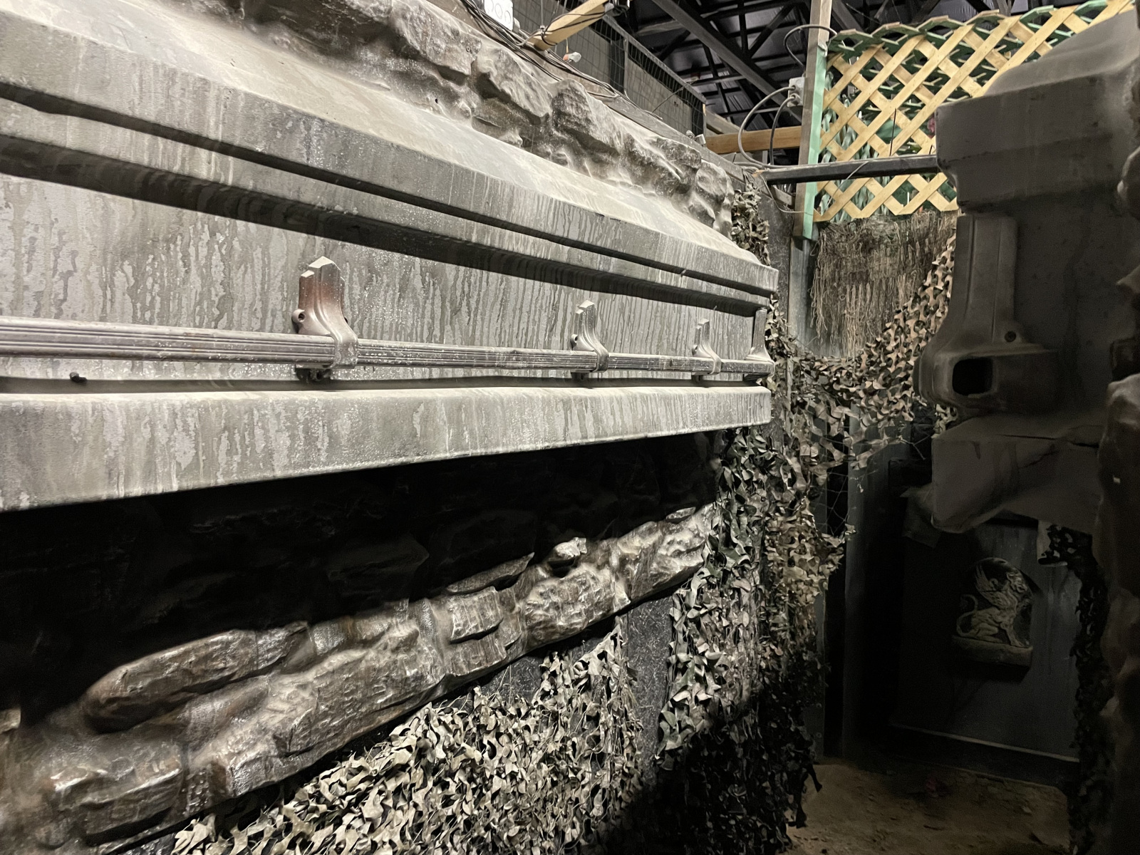 Many panels are scenically painted or ABS plastic vacuform faces on wooden frames. Panels and props were sprayed with flame retardant annually before opening.