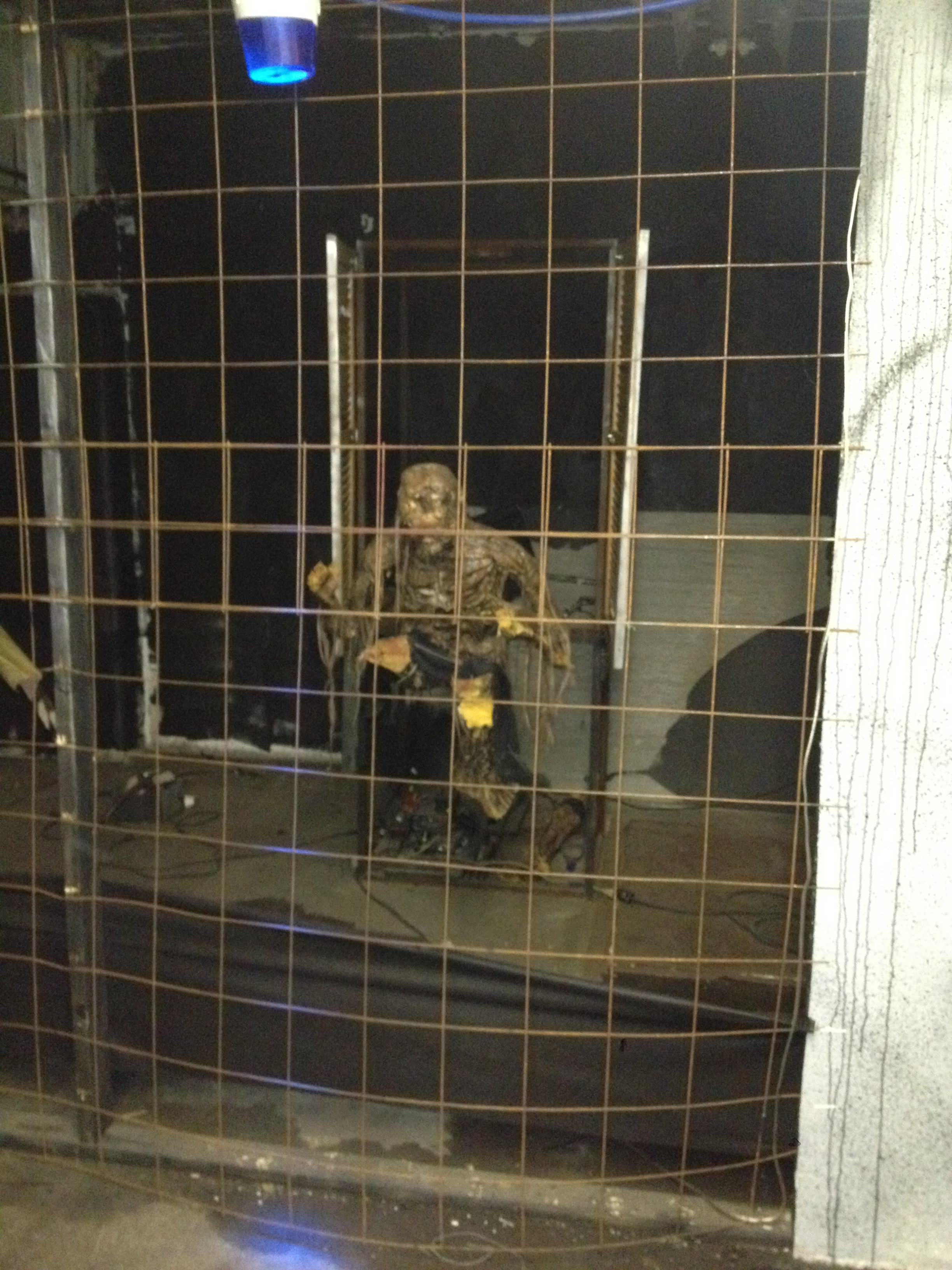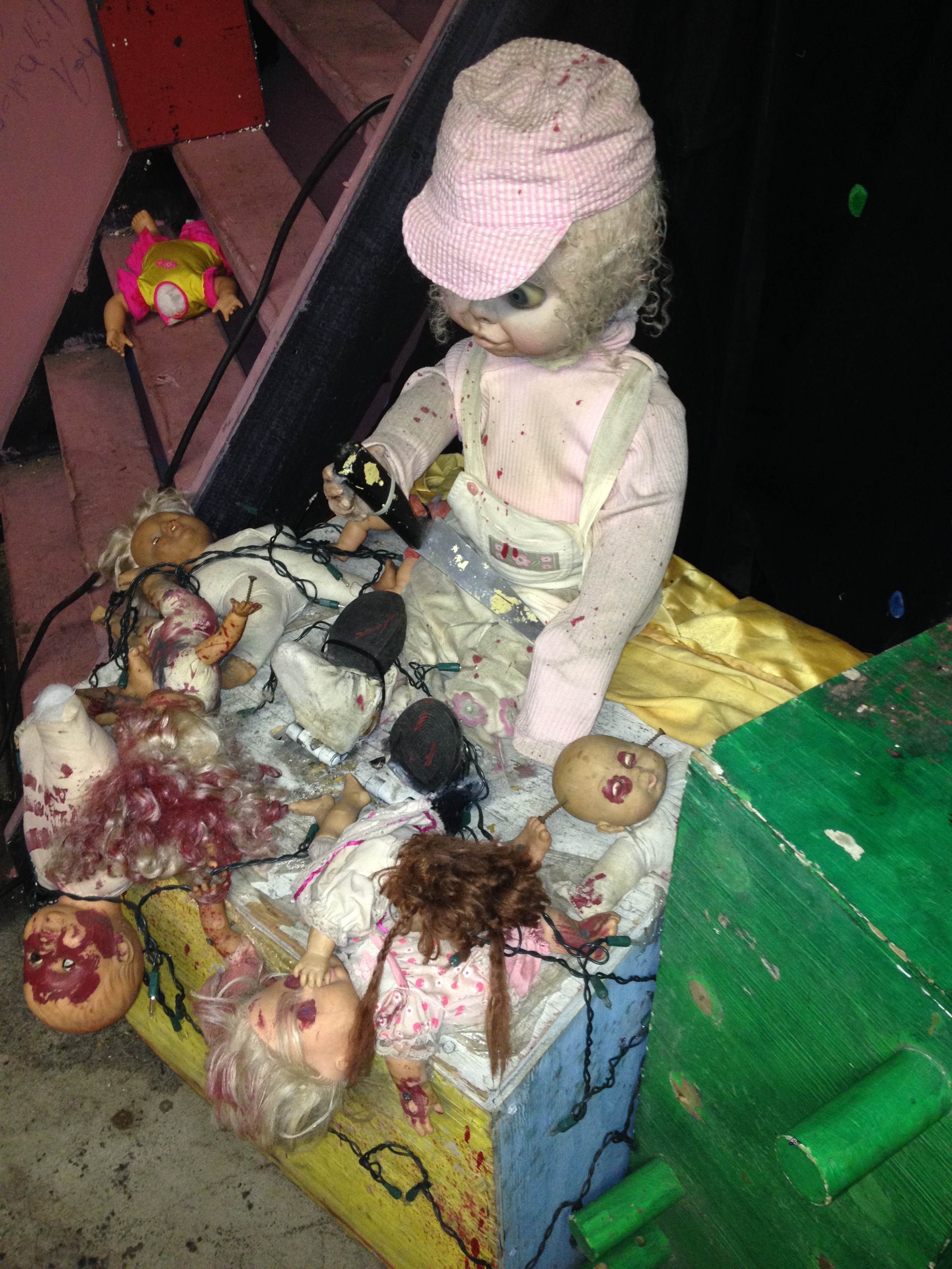 Show lighting is a combination of LED, Christmas and rope lighting, spot lights, dangling bulbs, strobes, lasers, and backlights. Several TVs used throughout the haunt with effects and a projector system with a “rat” effect.