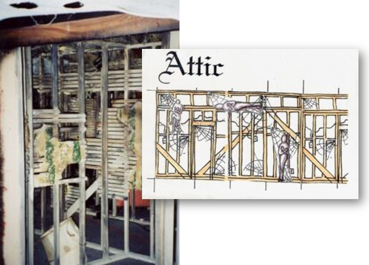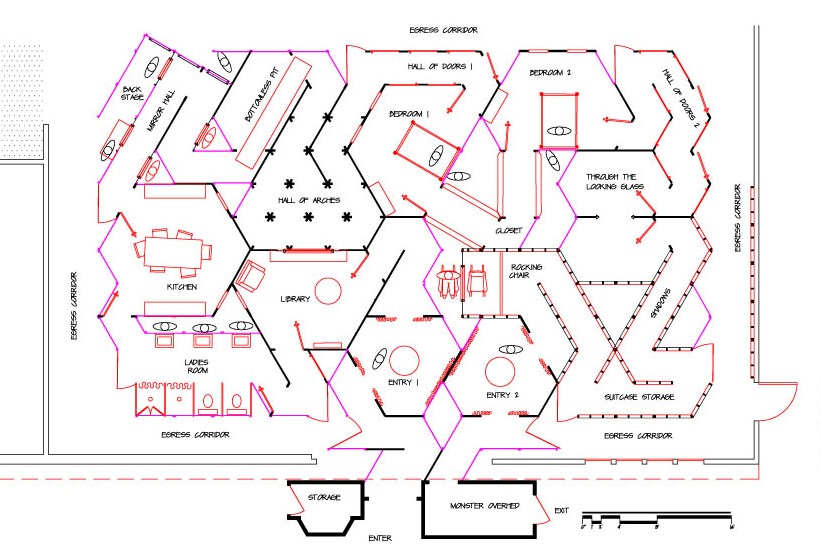 The scares in a Hauntrepreneurs® attraction are the key to fright effectiveness, and all room design concepts begin with what the actor will do to frighten guests in the space. “Designing from the inside out,” the set pieces and furniture are then placed in the space to control sight lines and define the pathway of the patrons. Then, and only then are walls located around the room design, allowing for staff backstage, actor returns and emergency egress.